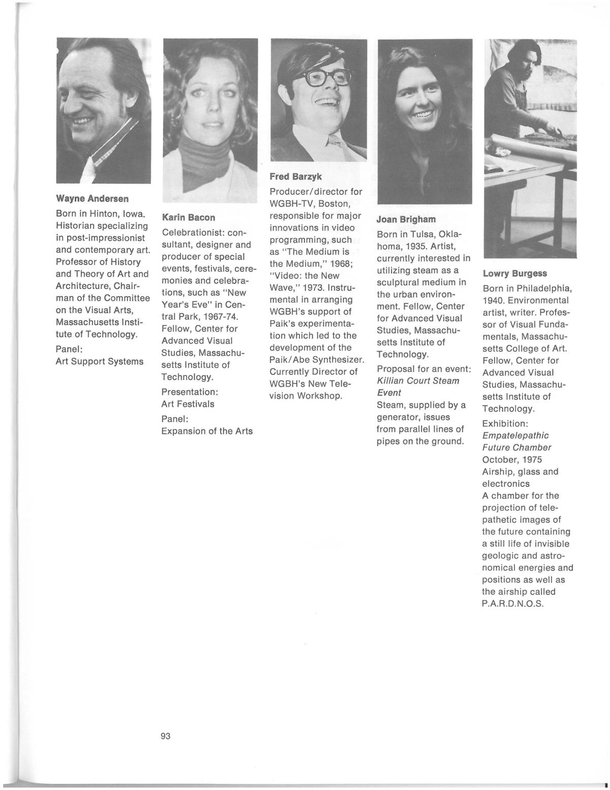 Publication developed for a conference titled "Arttransition" (also named as "Art Transition") examining new directions in intersections between art, science and technology at the Massachusetts Institute of Technology's Center for Advanced Visual Studies in 1975 held in collaboration with the University Film Study Center. Includes textual and visual submissions by contributing artists concerning environmental art, developmental media work, arts education, communication, video art, film, celebrations, and intersection of art, science and technology.