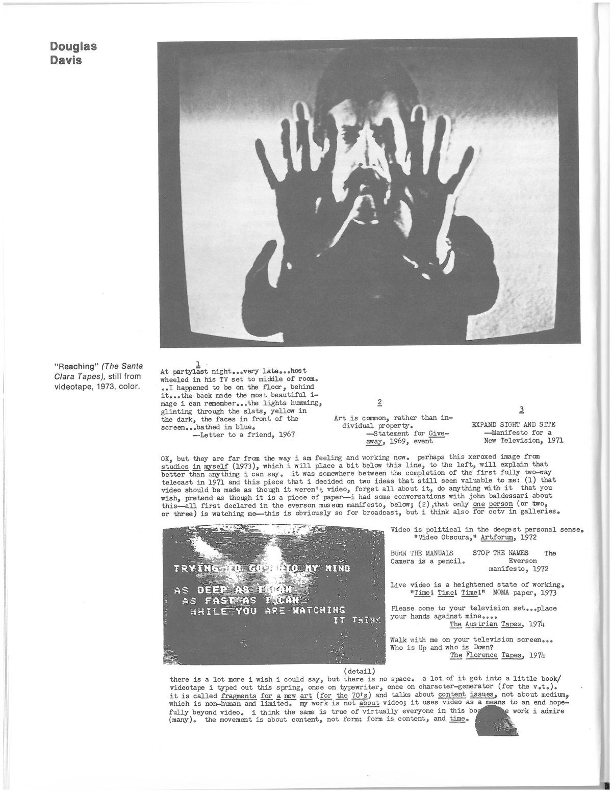 Publication developed for a conference titled "Arttransition" (also named as "Art Transition") examining new directions in intersections between art, science and technology at the Massachusetts Institute of Technology's Center for Advanced Visual Studies in 1975 held in collaboration with the University Film Study Center. Includes textual and visual submissions by contributing artists concerning environmental art, developmental media work, arts education, communication, video art, film, celebrations, and intersection of art, science and technology.