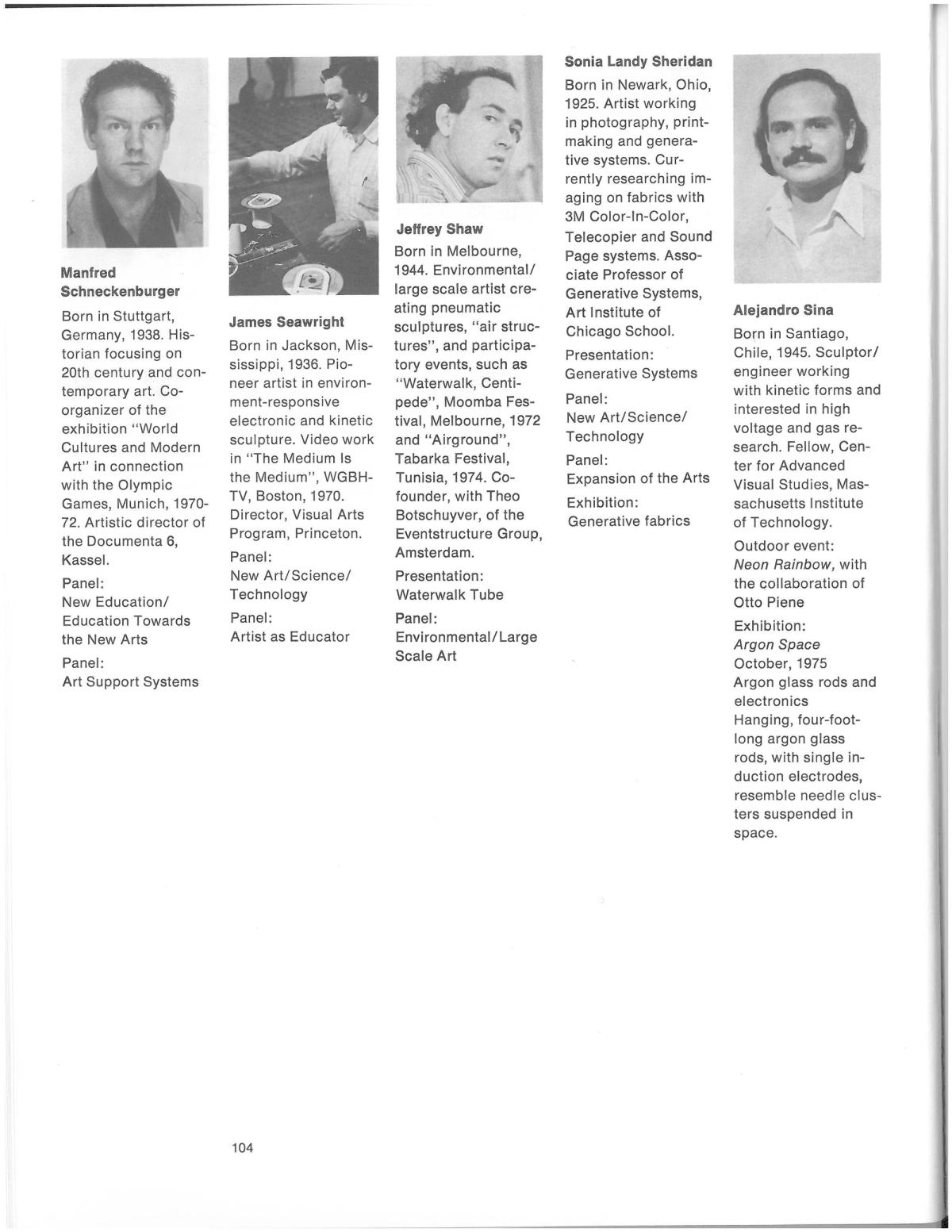 Publication developed for a conference titled "Arttransition" (also named as "Art Transition") examining new directions in intersections between art, science and technology at the Massachusetts Institute of Technology's Center for Advanced Visual Studies in 1975 held in collaboration with the University Film Study Center. Includes textual and visual submissions by contributing artists concerning environmental art, developmental media work, arts education, communication, video art, film, celebrations, and intersection of art, science and technology.