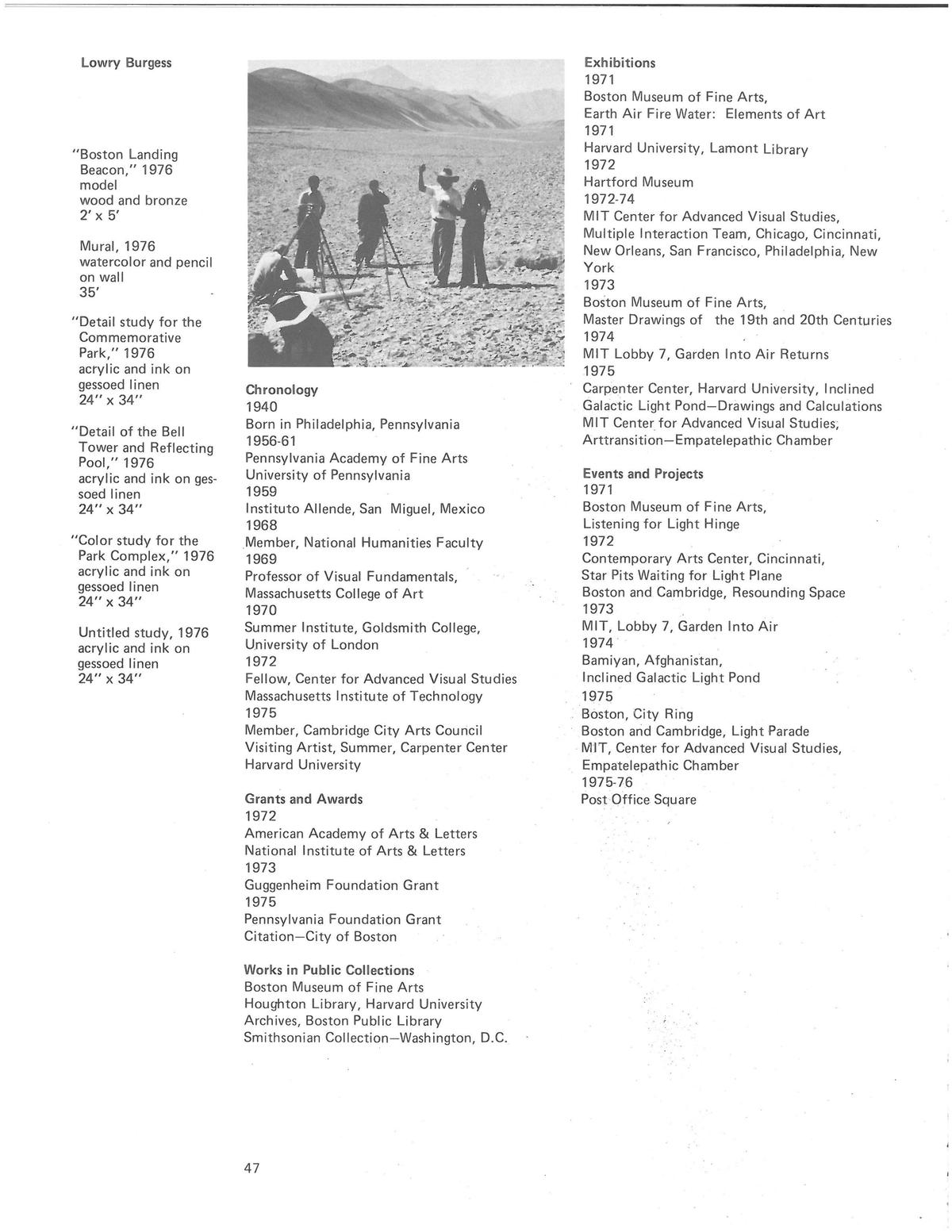 Exhibition catalog for second part of "Boston Celebrations" exhibition by fellows from the Center for Advanced Visual Studies at the Boston Institute for Contemporary Art, titled "You Are Here: Environmental Art." Includes essay submissions by the artists concerning topics in environmental art and civic art, descriptions and visual depictions of works in the exhibition, and profiles of the artists.
