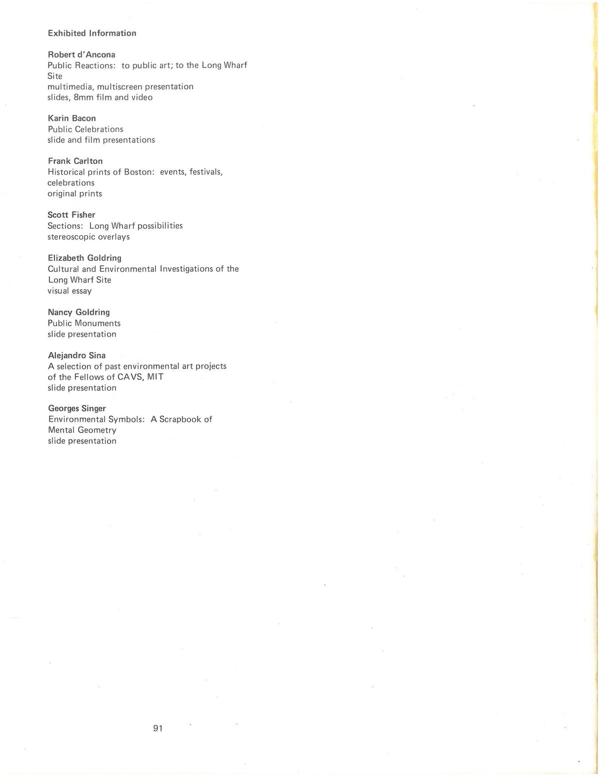 Exhibition catalog for second part of "Boston Celebrations" exhibition by fellows from the Center for Advanced Visual Studies at the Boston Institute for Contemporary Art, titled "You Are Here: Environmental Art." Includes essay submissions by the artists concerning topics in environmental art and civic art, descriptions and visual depictions of works in the exhibition, and profiles of the artists.