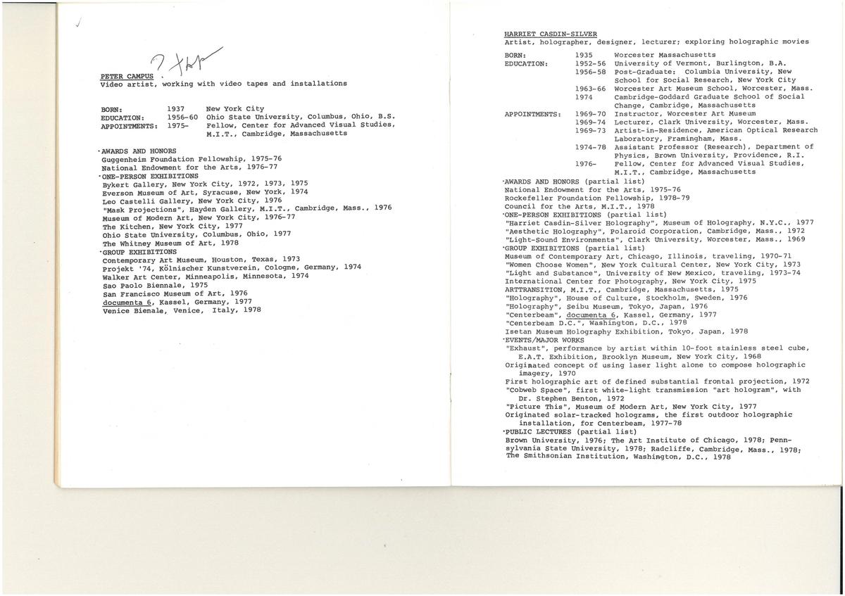 Listing of courses offered by MIT Center for Advanced Visual Studies for the spring semester of the 1978-1979 academic year. Course offerings in this publication were for the Masters of Science in Visual Studies graduate degree program, also referred to as SMVisS or MSVisS.