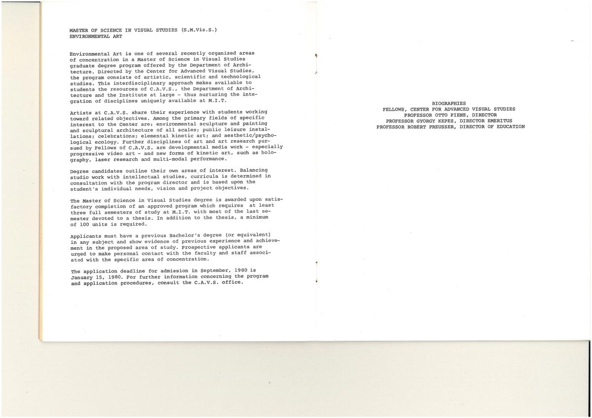 Listing of courses offered by MIT Center for Advanced Visual Studies for the spring semester of the 1978-1979 academic year. Course offerings in this publication were for the Masters of Science in Visual Studies graduate degree program, also referred to as SMVisS or MSVisS.